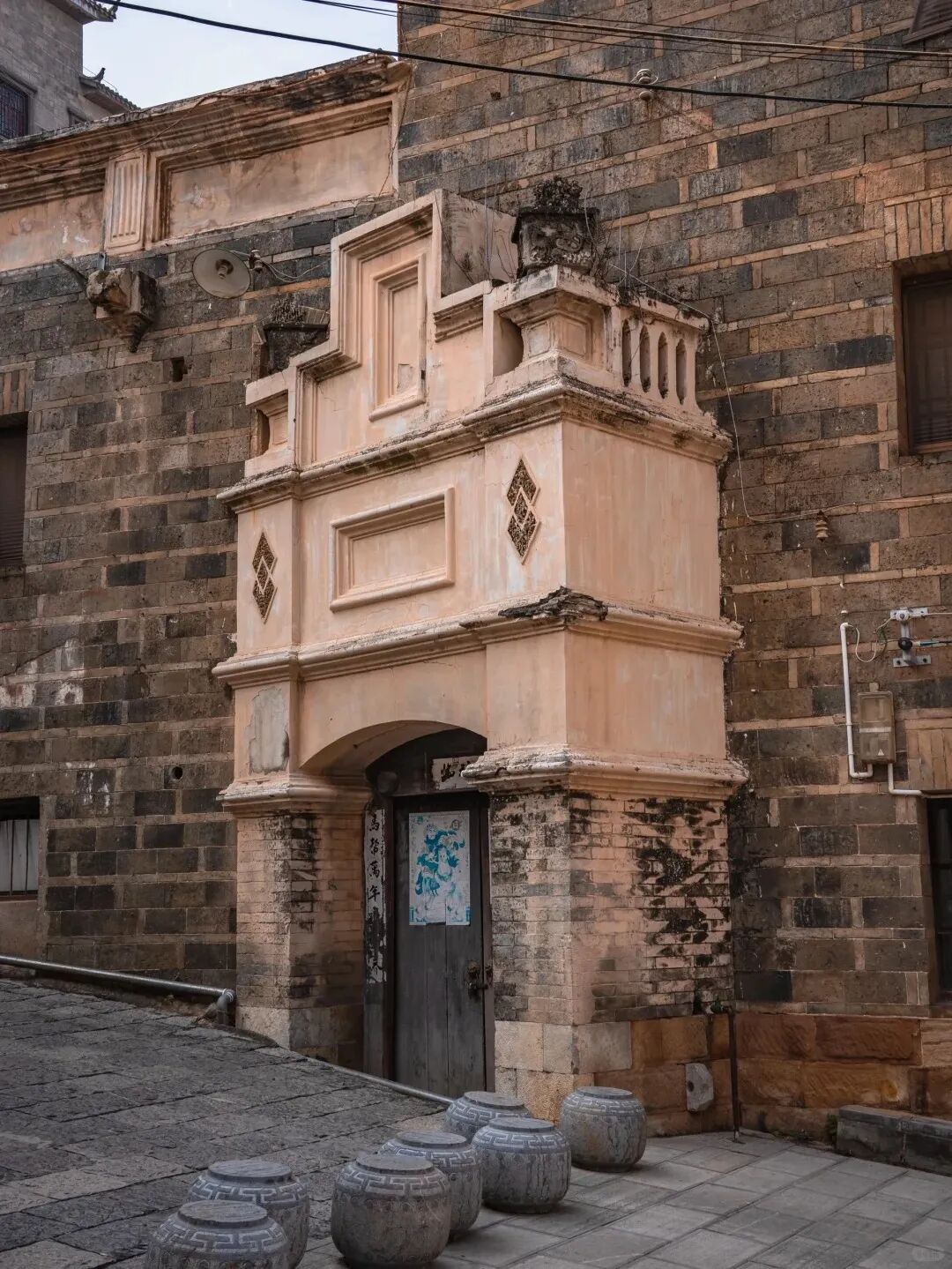 姚初居从 1937 年动工耗时 7 年建成,三层跑马转角楼的外观是法式碉堡模样,阳台设有防御射击孔,大门顶的 “钟表”“十字” 浮雕带着西洋印记,内部却恪守中式天井与厢房的对称布局,584 平方米的院落里,砖缝间都嵌着马帮带回的水泥。