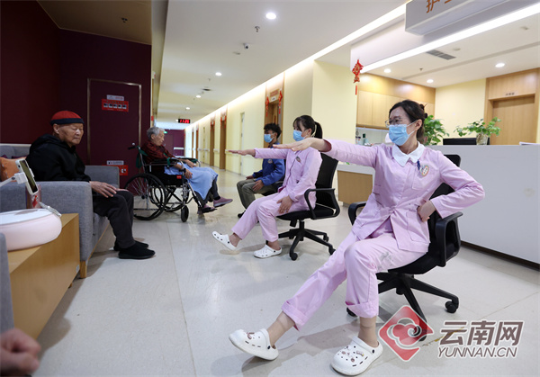 老人在古滇康养园跟着护士一起做操。陈飞 摄