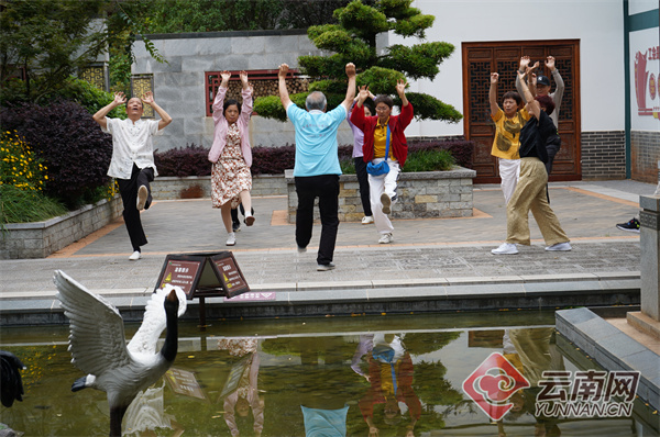 石林县杏林大观园的旅居老人在做养生操。供图