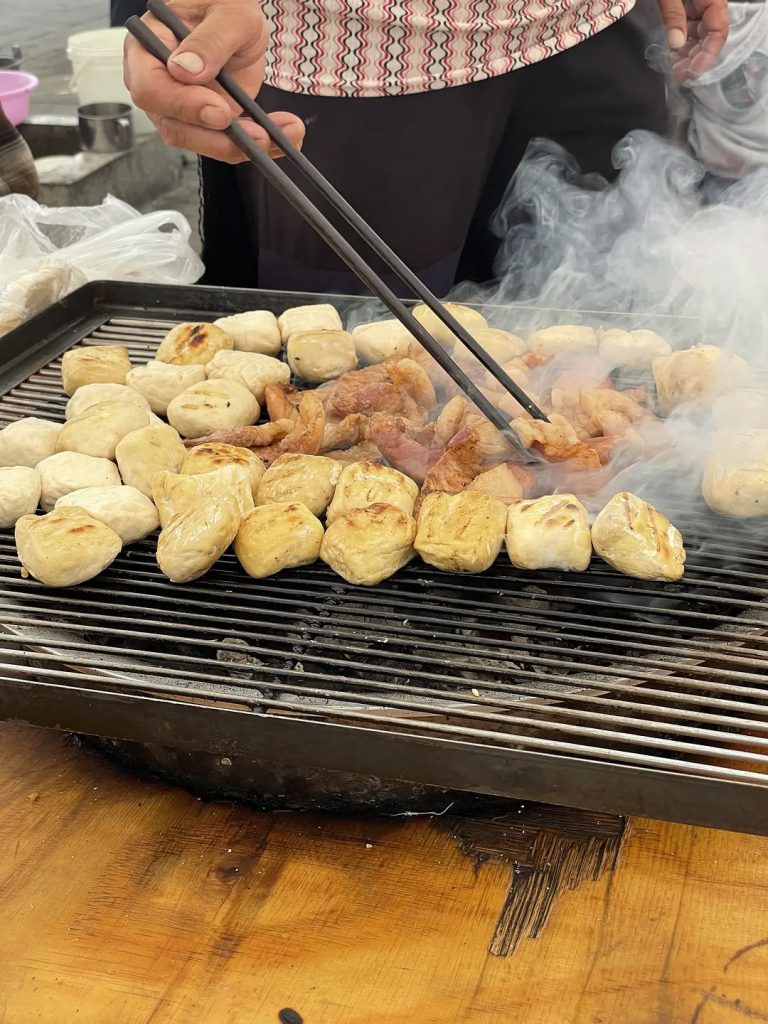 集市烧烤摊很火,自己去肉摊买新鲜肉,15元左右一斤,再拿给摊主加工烧烤,加工费10元