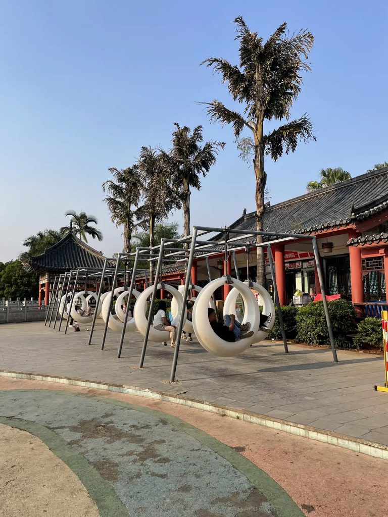 休闲区,很多人躺在月亮秋千里休息