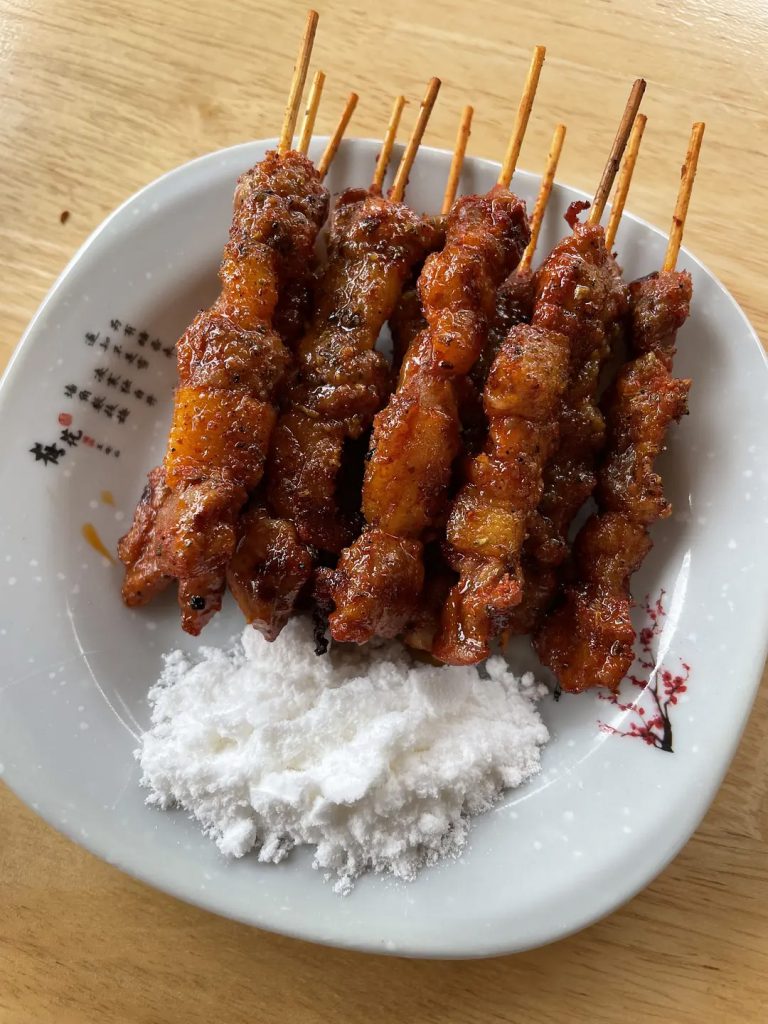 个旧小肉串蘸糖粉,味道竟然还挺好