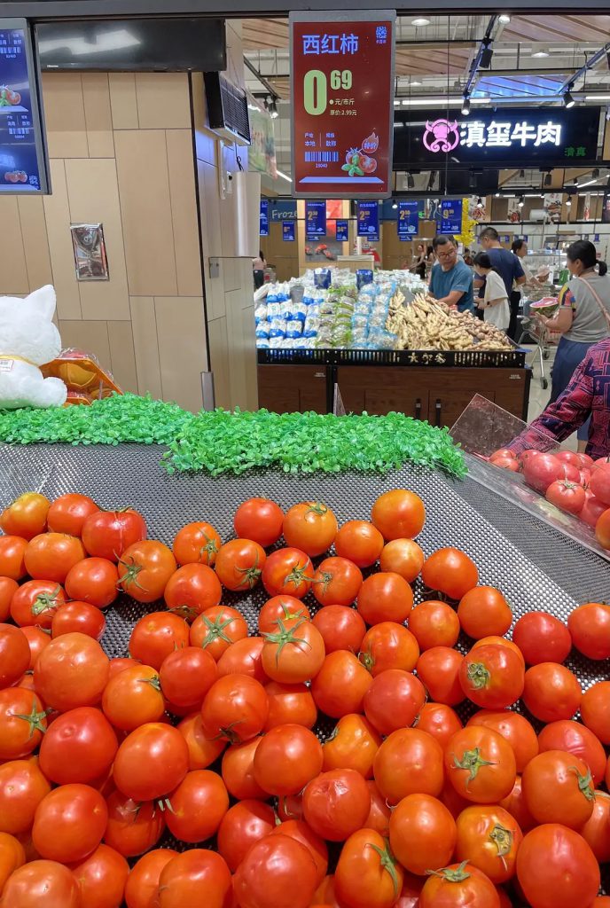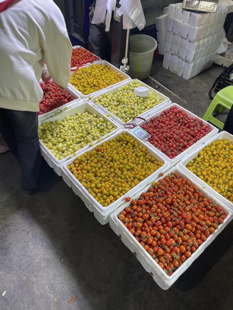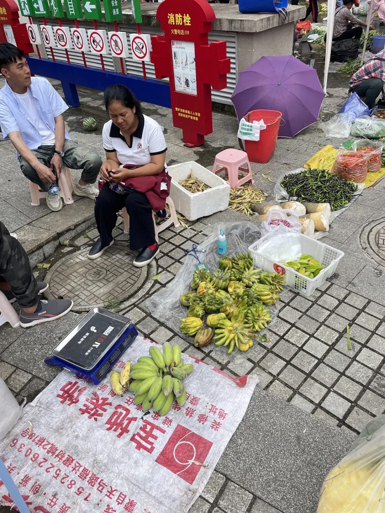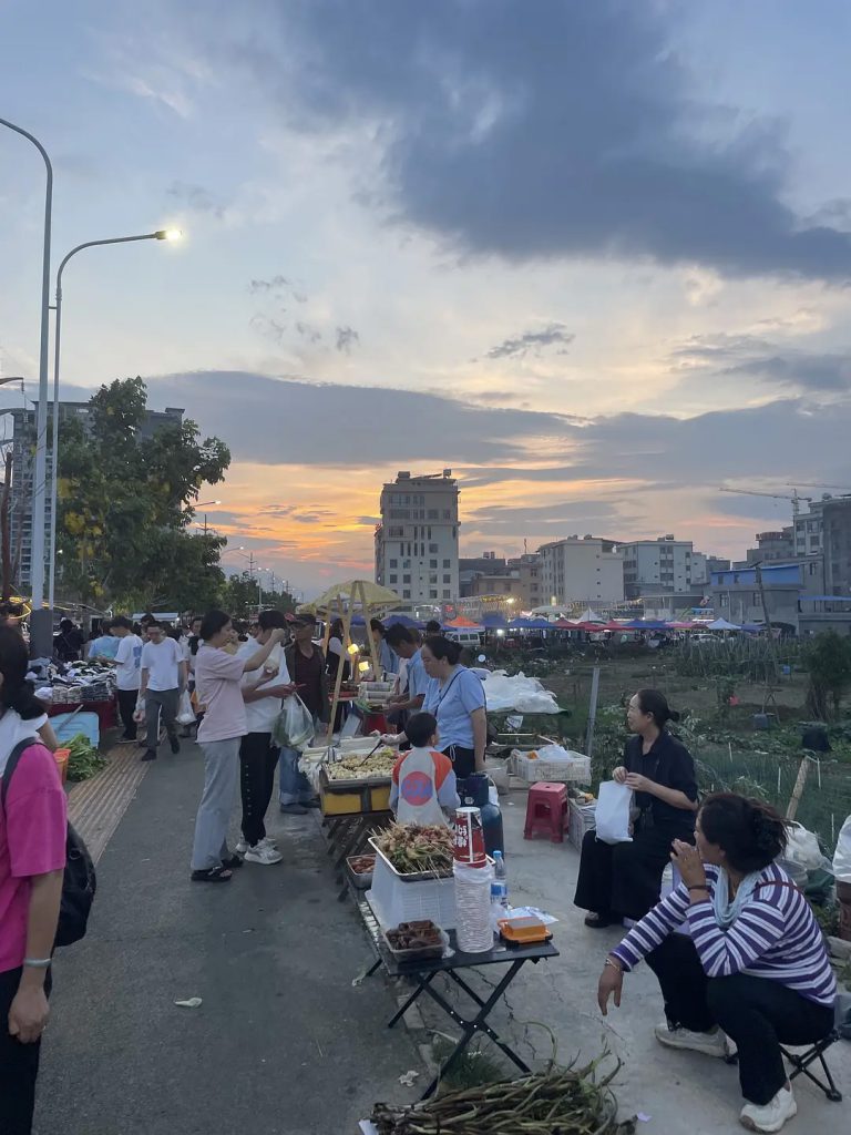 大树寨:每天下午六点左右陆续出摊。水果很多,4月的蓝莓、橘子,5月的荔枝、杨梅,6月的桃子、李子,西瓜一直都有。有时候可以买到很便宜的蔬菜,买到过甜玉米2元/斤,西红柿1.5元/斤,找专门卖某一种水果蔬菜的摊子会更便宜,什么都卖的通常比较贵。大树寨没有卖肉类和海鲜。